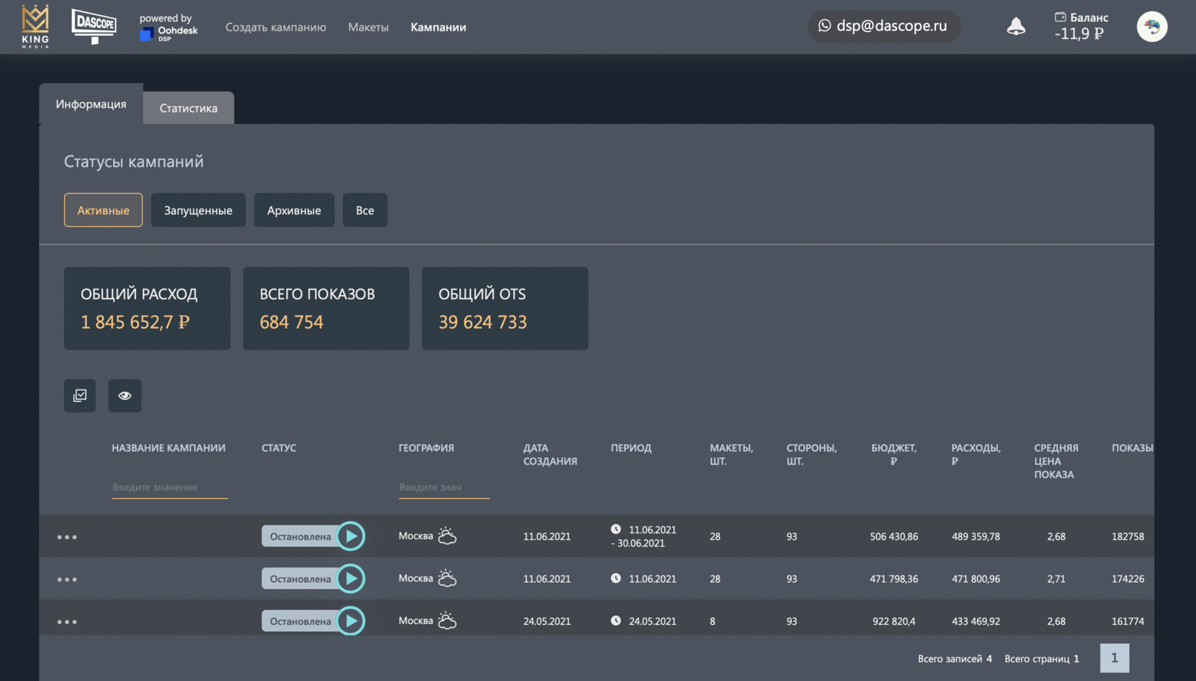 Рекламная кампания запущена. В режиме реального времени вы сможете редактировать креативы, останавливать рекламу, видеть статистику показов и многое другое.
